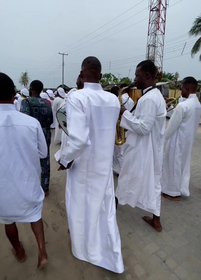 A group of people are walking down a road together. They are all wearing white robes, and most of them are barefoot. Some of them are carrying musical instruments, including drums, trumpets, and saxophones. They appear to be part of a religious procession, as they are walking past a large golden cross. The scene takes place in a rural area, with small buildings and power lines visible in the background. The sky is overcast.