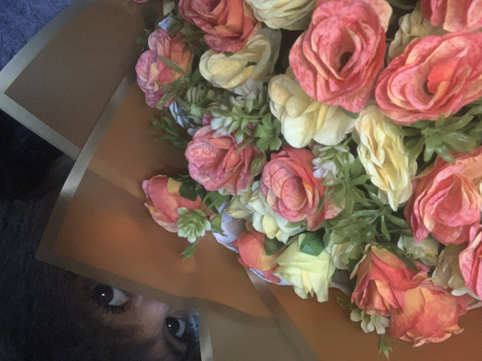 A bouquet of faux flowers dominates the view, featuring roses in shades of pink, peach, and yellow, interspersed with artificial greenery