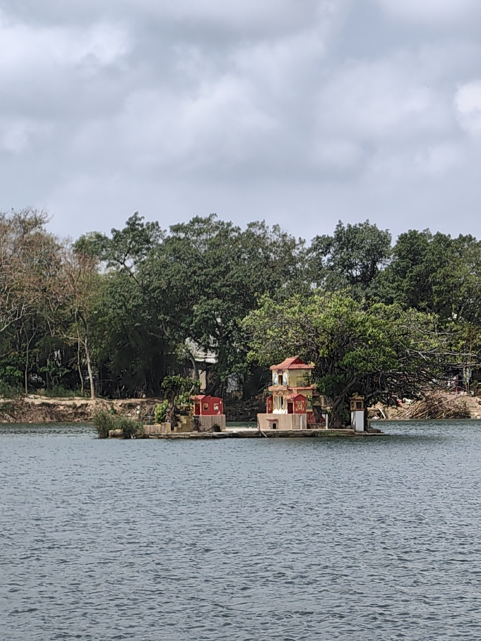 The image captures a static scene on a body of water within Vỹ Dạ Ward, Vietnam, under an overcast sky. In the midground, a small, light-colored, man-made island platform supports three miniature architectural structures. The leftmost structure is a small, red, single-story building with a sloping roof. To its right, a more elaborate, multi-tiered miniature pagoda or temple stands, displaying reddish-brown, orange, and cream coloration with architectural detailing. A smaller, white, single-story structure with a peaked roof is partially visible to the immediate right of the pagoda. The foreground consists of dark blue-green water with subtle surface ripples. The background reveals a distant landmass densely covered with trees, ranging from those with sparse, bare branches on the left to lush green foliage across the majority, bordering an exposed, somewhat eroded bank. No individuals or visible activity are present in the scene.