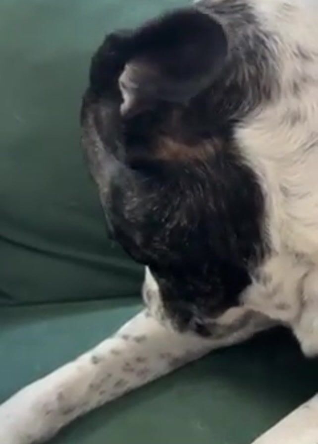 - "close-up of a dog lying on a green couch and licking its white leg with black spots" by FM-j80jY2, licensed under CC BY 4.0