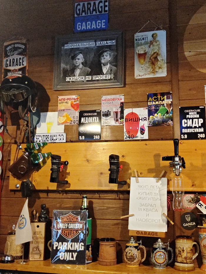 The interior of a garage-themed bar features wooden walls adorned with various signs and paraphernalia. A "Garage" sign hangs above a framed black and white photo. Motorcycle memorabilia, including a helmet and "Harley-Davidson" signs, are prominent. Several drink advertisements and a handwritten sign detailing a summer special are displayed. Beer taps and a collection of beer steins sit on a shelf below, adding to the bar's rustic aesthetic.