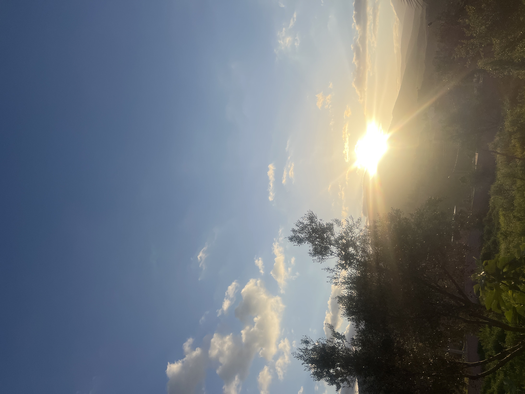 The image depicts a sunny landscape in Ouaouizert, Morocco. The sky is a gradient of blue, with scattered white clouds in the lower left. The sun is intensely bright, positioned near the horizon and partially obscured by a mountain range in the background. Vegetation, including trees and greenery, is visible in the lower right and foreground. The overall scene evokes a sense of warmth and natural beauty.