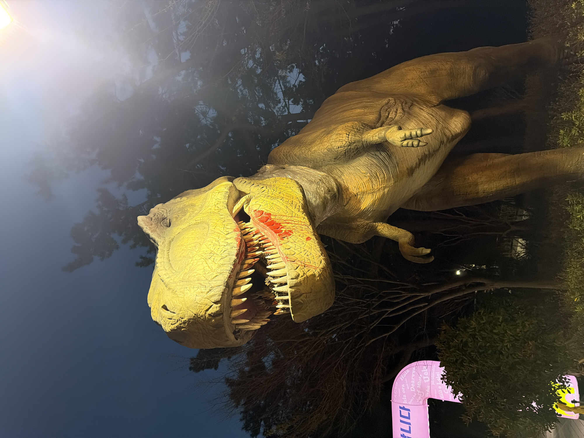 T-Rex dinosaur model standing in a park. The dinosaur is yellow, has exposed teeth, and red paint around its mouth, possibly simulating blood. It is situated outdoors with trees in the background. A light source is casting a bright glare in the upper left corner of the image. Below the dinosaur, an arch with multilingual greetings in a pink color is visible. The arch includes greetings like "Hola" and other less discernible languages. It also includes the text "#니다". Given the presence of Korean script and the multilingual arch, the location is likely in the city of Busan, South Korea.