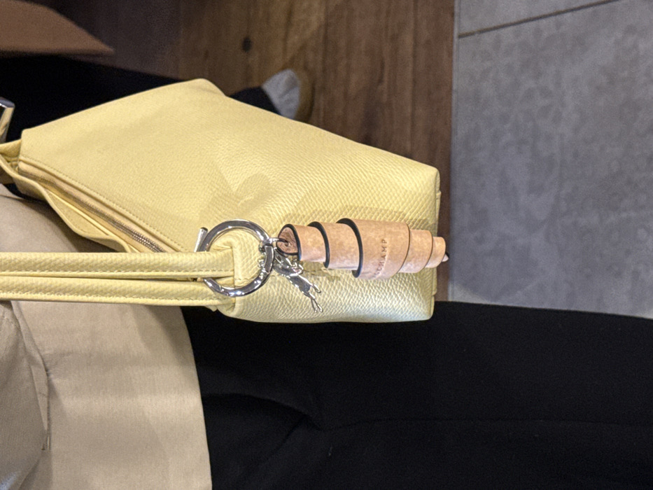 The image captures a close-up of a person's midsection in an interior setting within the city of London, United Kingdom. The individual wears a light tan top and dark trousers. They are carrying a textured, light yellow handbag on their left side, from which a silver keyring is suspended. Attached to this keyring is a light brown, croissant-shaped keychain, marked with the word "LONGCHAMP" and featuring dark decorative wraps. A smaller silver charm, depicting a galloping horse, is also connected to the keyring. The background consists of a section of dark brown wooden flooring transitioning into a gray floor surface, possibly tiled or carpeted. A portion of another person's foot, clad in a light-colored shoe, is visible in the blurred background on the right.