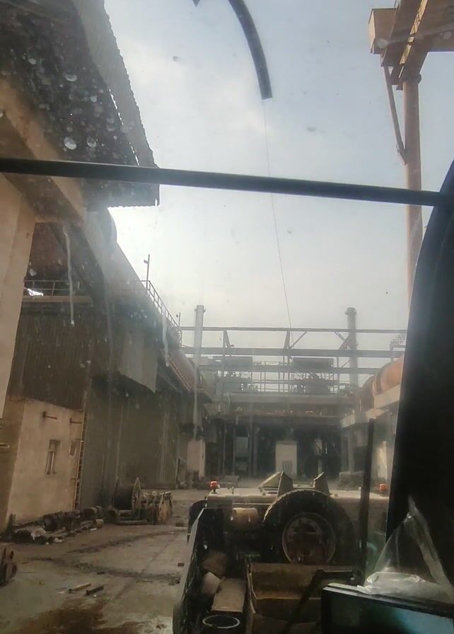 view from inside a vehicle, potentially a crane or other industrial vehicle, looking out through a dirty window. The view includes metal structures, possibly part of a factory or construction site, and a building with a corrugated roof. There is also a tire visible within the vehicle's framework. On the right side of the frame, there are two electronic screens and a person's legs covered in blue jeans. The overall lighting is bright, but the visibility is somewhat obscured by dirt on the window. The video is oriented vertically.