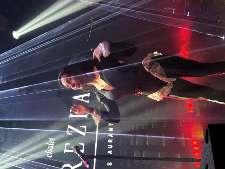 A female performer is depicted on a stage under theatrical lighting at Chalet Rezia Restaurant & Lounge in Business Bay, دبي, United Arab Emirates