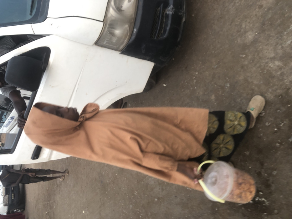 An image captured in the city of Kufena, Nigeria, depicts a young person, likely a child, walking from left to right across an unpaved, dirt surface. The individual wears a tan, long-sleeved hooded garment and a dark skirt or wrapper with light green or yellow circular patterns. They are wearing light-colored, slip-on shoes. In their right hand, they carry a transparent plastic bucket with a yellow handle, containing light-brown, granular contents. To the right, a white van, possibly a Toyota Hiace, is partially visible with its passenger-side door open. A dark-skinned individual's head and arm are visible inside the vehicle's cabin or near the open door. Text reading "Munamawa State" is partially visible on the van's side. The van's front features a dark bumper and headlights. In the background, to the left of the frame, another individual, an adult male, walks in the same direction as the primary subject. He wears a dark shirt and dark shorts, with sandals on his feet. Part of a white vehicle is also visible further back on the left. The overall scene appears to be an active street or market environment.