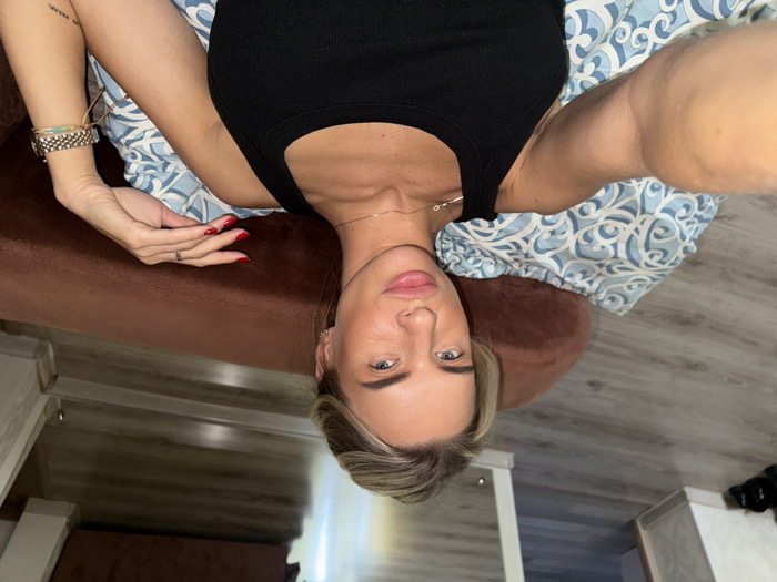 A female subject, with blonde hair pulled back, blue eyes, and full lips, directly faces the camera. She wears a black ribbed tank top and a thin gold-colored necklace. Her left hand exhibits red nail polish and a thin gold-colored ring on the ring finger. Her right wrist is adorned with multiple bracelets, including a gold-colored chain, beaded elements, and a leather-like band, alongside a metallic-strapped watch. A small dark tattoo is visible on her inner right forearm. The subject's right arm is extended, holding a device to capture a selfie. The scene is a residential interior in Kaliningrad, Russia. The subject is reclined against a brown upholstered surface. She rests on a blue and white patterned fabric, likely a pillow or blanket. The flooring is light-colored wood laminate, visible in the background along with light-colored walls. A partial doorway to another room is present in the upper left background, near which a dark object, possibly footwear, rests. A reflective surface, such as a mirror or polished furniture, occupies the right side of the background, showing reflections of the room.