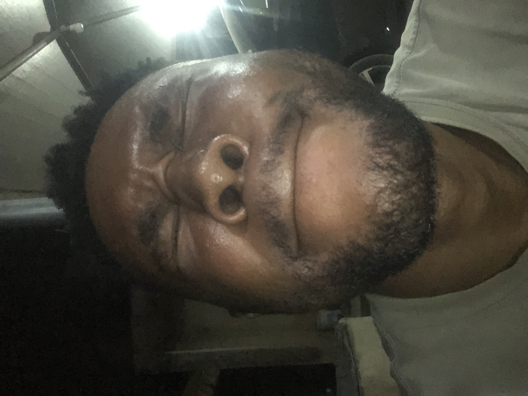 A close-up, low-angle shot depicts a man's face with dark skin and a thick, dark beard. The man's eyes are closed, and his face appears to be compressed. His skin is shiny, possibly from sweat or moisture. The background is dark and indistinct, but elements such as a white shirt collar, and a possible headrest or ceiling of a vehicle are visible. It is not possible to infer a location in any city.