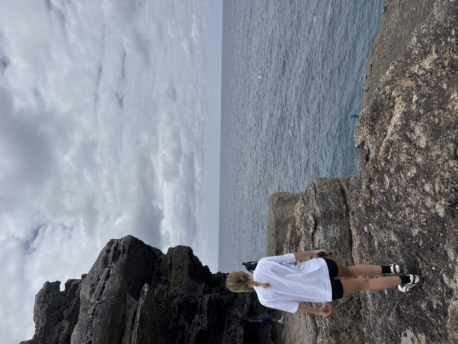 A woman with a blonde braid, wearing a white shirt and black shorts, stands near the edge of a rocky cliff overlooking a vast ocean. Her back faces the viewer. Behind her, rugged, dark rocks rise up. In the distance, other people are visible on the cliffside. Above, the sky is filled with textured, gray clouds, creating a sense of overcast weather. The ocean stretches to the horizon, meeting the cloudy sky.