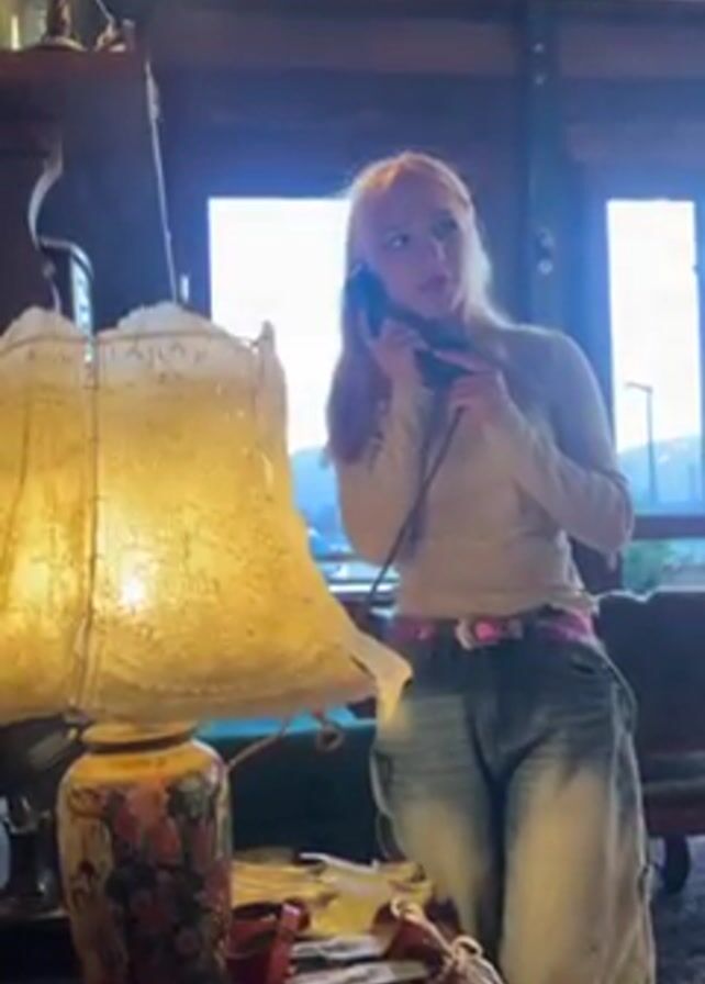 A young, fair-skinned woman with light reddish-blonde hair is standing in an indoor setting, holding a black landline telephone receiver to her left ear and speaking into the mouthpiece. She is wearing a long-sleeved beige shirt, baggy light-wash denim jeans, and a pink belt with silver detailing. The room has a rustic or vintage aesthetic. To the left of the woman is a large, ornate table lamp with a yellowed, patterned shade and a vase-like base featuring floral designs. The table beneath the lamp is cluttered with various items, including a bottle with a yellow cap, papers, and a red bag. In the background, through a window, there is a view of mountains and what appears to be a lamp post, indicating an outdoor setting. The lighting in the room is provided by the lamp and natural light coming through the window, creating a warm but somewhat dim ambiance. The scene conveys a sense of being in a unique, possibly older, home setting.