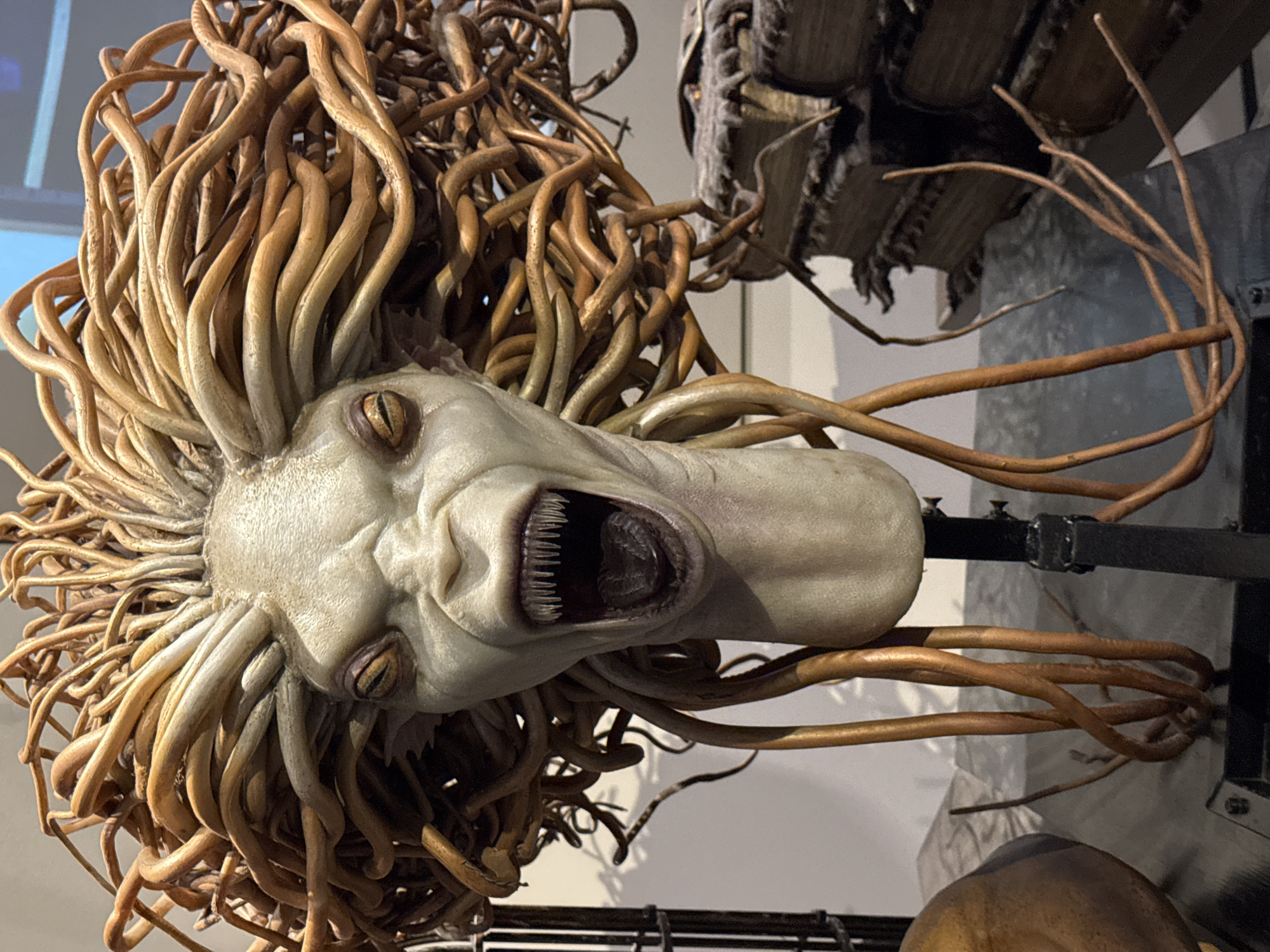The image displays a detailed prop located in Three Rivers, United Kingdom, consistent with an indoor exhibit. The central subject is a bust of a creature, identified as a merperson from the Harry Potter series. Its head is pale greenish-gray with a wrinkled, mottled skin texture. The creature's eyes are deeply set and yellowish-brown, while its mouth is wide open, revealing numerous sharp, pointed white teeth and a dark, fleshy throat cavity. A dense mass of intertwined, coppery-brown, tentacle-like strands forms its hair, with several strands extending downwards onto the dark, flat display surface. The bust is supported by a black metal stand. To the right of the bust, a stack of heavily aged, dark-bound books with ragged edges and discolored pages is visible. A blurred, rounded, brown object is partially seen on the left. The background consists of a light-colored wall with a diffused blue light source in the upper right. The scene is static and well-lit.