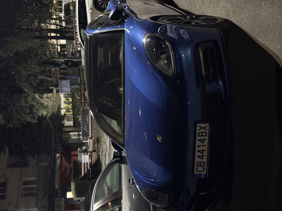 The image displays a blue Porsche Panamera parked at night on an asphalt or concrete surface in Pernik, Bulgaria