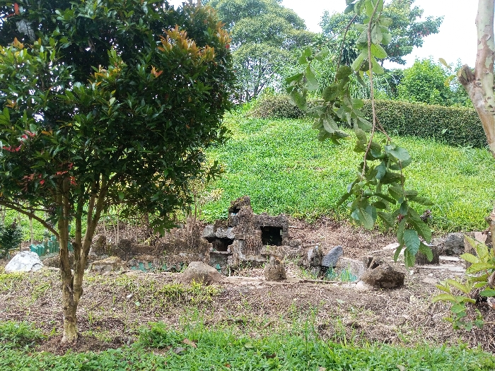 A natural outdoor scene shows a lush, grassy hillside with a constructed stone feature at its base. The stone structure, appearing like a small ruined building, is surrounded by rocks and sparse vegetation. To the left stands a vibrant tree with green and reddish foliage, while a branch with dangling leaves hangs in the right foreground. A neatly trimmed hedge runs along the top of the hill, and larger trees are visible in the distance. The scene conveys a sense of both natural beauty and subtle human landscaping.