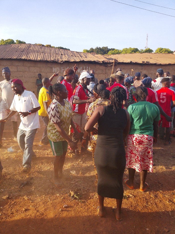 A group of people gathers outdoors. The majority are dressed casually in various colored shirts and dresses. A wall made of mud bricks and topped with corrugated metal sheets is visible in the background, along with a tower. The ground is dirt with scattered debris. Some people are wearing hats or head coverings. The overall atmosphere suggests a community gathering or celebration.