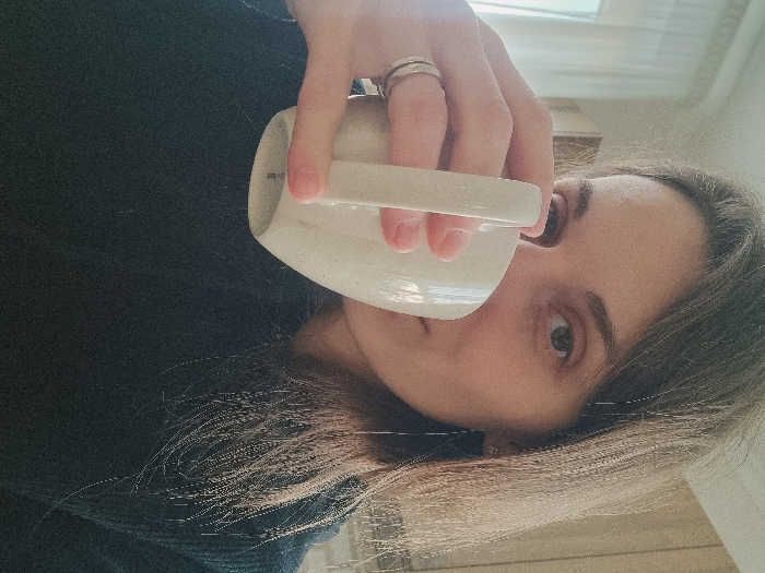 A person holds a white mug up to their mouth. The person wears a dark shirt. The hand holding the mug has two rings on the ring finger. The background includes a window with blinds. The person has light skin, brown hair, and light eyes. The photo appears to be taken indoors.