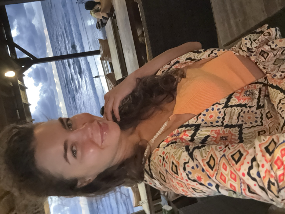 The image displays a female individual in the foreground, positioned within an open-air, wooden structure with a visible thatched roof and an overhead light fixture. She has long dark hair, styled partially up, and is smiling directly at the camera, with her left hand touching her neck. She wears an orange ribbed crop top, a multi-colored patterned open kimono, and a white beaded necklace. Behind her, within the structure, are several dark wooden tables and benches equipped with light-colored cushions. In the background, the ocean exhibits choppy waves under a cloudy, twilight sky. A solitary figure stands upright on the beach at the water's edge, while other individuals are visible seated further right along the shoreline. This beachside scene is located in the city of Canggu, Indonesia.