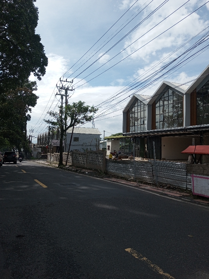 The image captures a street scene in the city of Domphoog_Dungkarchhoeling, Bhutan, under a partly cloudy sky. The foreground features an asphalt road with faint yellow dashed lane markings. On the left side of the road, a large tree with dark green foliage partially obscures a dark-colored SUV and a motorcycle traveling in the same direction. A concrete utility pole, heavily laden with power lines and insulators, stands further down the left side, with a smaller tree immediately behind it. Beyond the pole, a low, patterned concrete fence lines the street, behind which several buildings are visible, including a white structure and multiple structures with pointed, spire-like roof elements. On the right side of the road, a construction or renovation site is enclosed by a low, corrugated metal fence. Several individuals, including one in a yellow garment, are present within this site, engaged in unspecified activities. The most prominent structure on the right is a multi-story building featuring a distinct gabled roofline composed of several angular peaks and large, reflective glass windows on its upper facade, with vertical light-colored and dark paneling. The ground floor of this building appears unfinished or open, revealing structural elements. A small structure with a red, gabled roof is partially visible in the lower right foreground. Numerous overhead power lines traverse the sky across the entire frame.