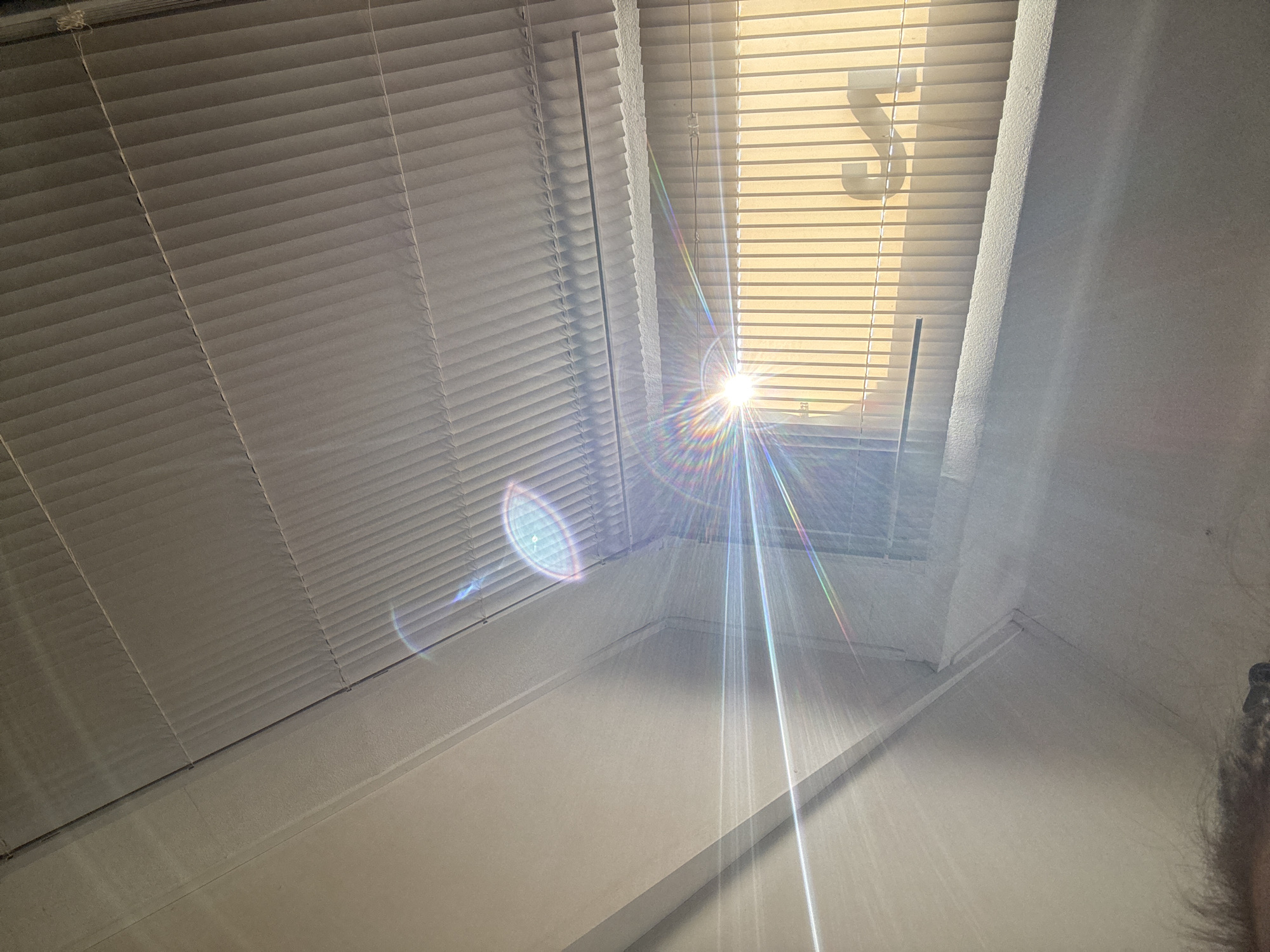 An interior corner of a room features two sets of horizontally slatted Venetian blinds, appearing to meet at a right angle. Strong, direct sunlight penetrates through the partially open blinds on the left, causing significant lens flare with prominent radial light spikes and a spectrum of colors originating from the center-left. A secondary, circular lens flare is visible in the upper right quadrant. The left blinds display a distinct "S"-shaped shadow cast upon them, indicating an object positioned outside the window. The walls and ceiling are light-colored and appear textured. Simple coving or trim is present where the walls meet the ceiling and along the corner. A dark, blurry, textured mass, consistent with human hair or fur, is visible in the extreme upper-left corner, suggesting a partial view of an individual, possibly the photographer. No other individuals or specific identifying objects are discernible. The specific location within Reigate and Banstead, UK, cannot be determined from the visual information provided.