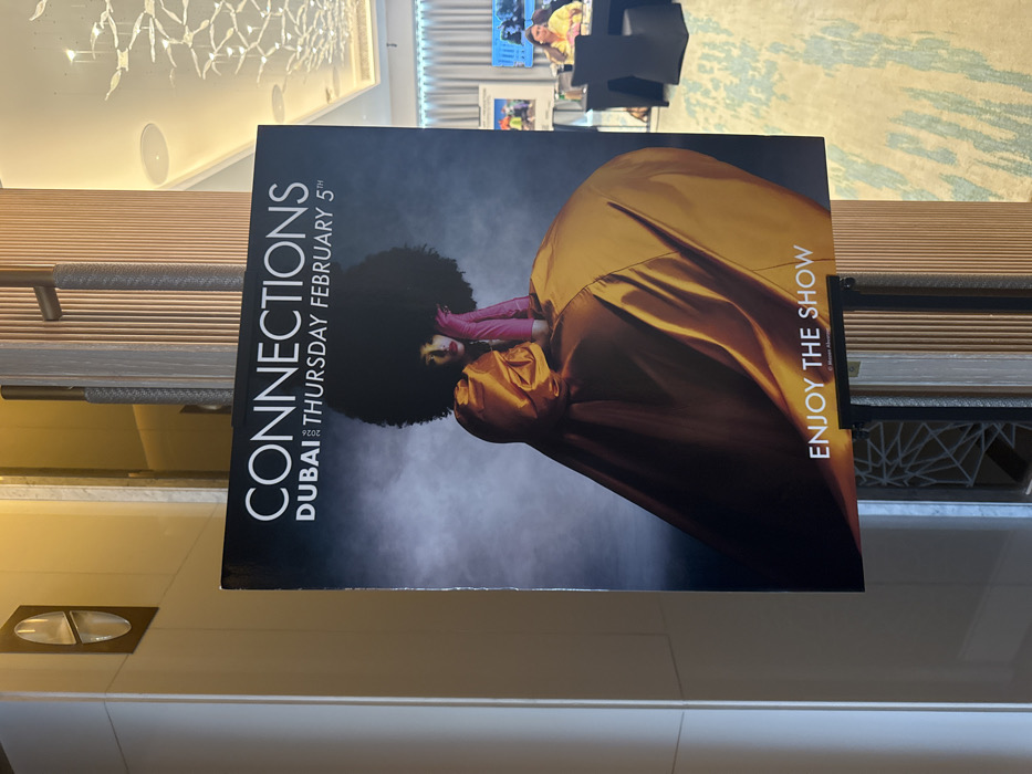 - "A vertical promotional poster for "CONNECTIONS DUBAI THURSDAY FEBRUARY 5TH" is centrally displayed on a black metal easel in an indoor environment in Business Bay, United Arab Emirates" by FM-lgQ922, licensed under CC BY 4.0