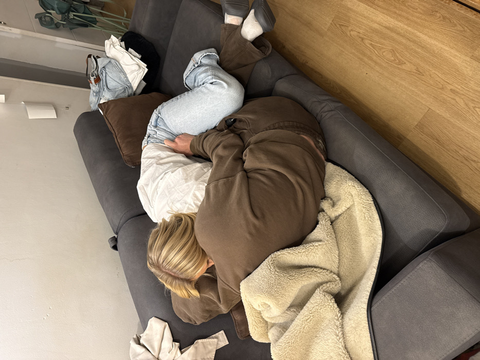 A person lies face down on a gray couch covered in a brown hoodie and a beige, fleece-lined blanket
