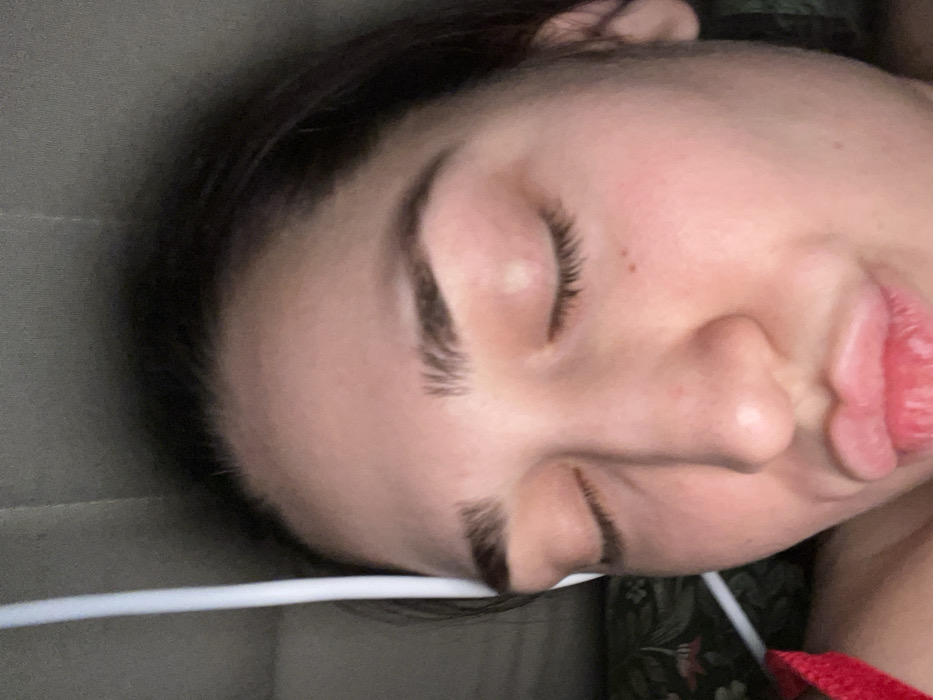 A close-up, tilted shot of a woman's face with her eyes closed. Her dark hair is visible around her forehead. The skin appears smooth and fair. She has well-defined eyebrows and long eyelashes. Her lips are slightly pursed and appear pink. A white cable is visible across the lower part of her face.