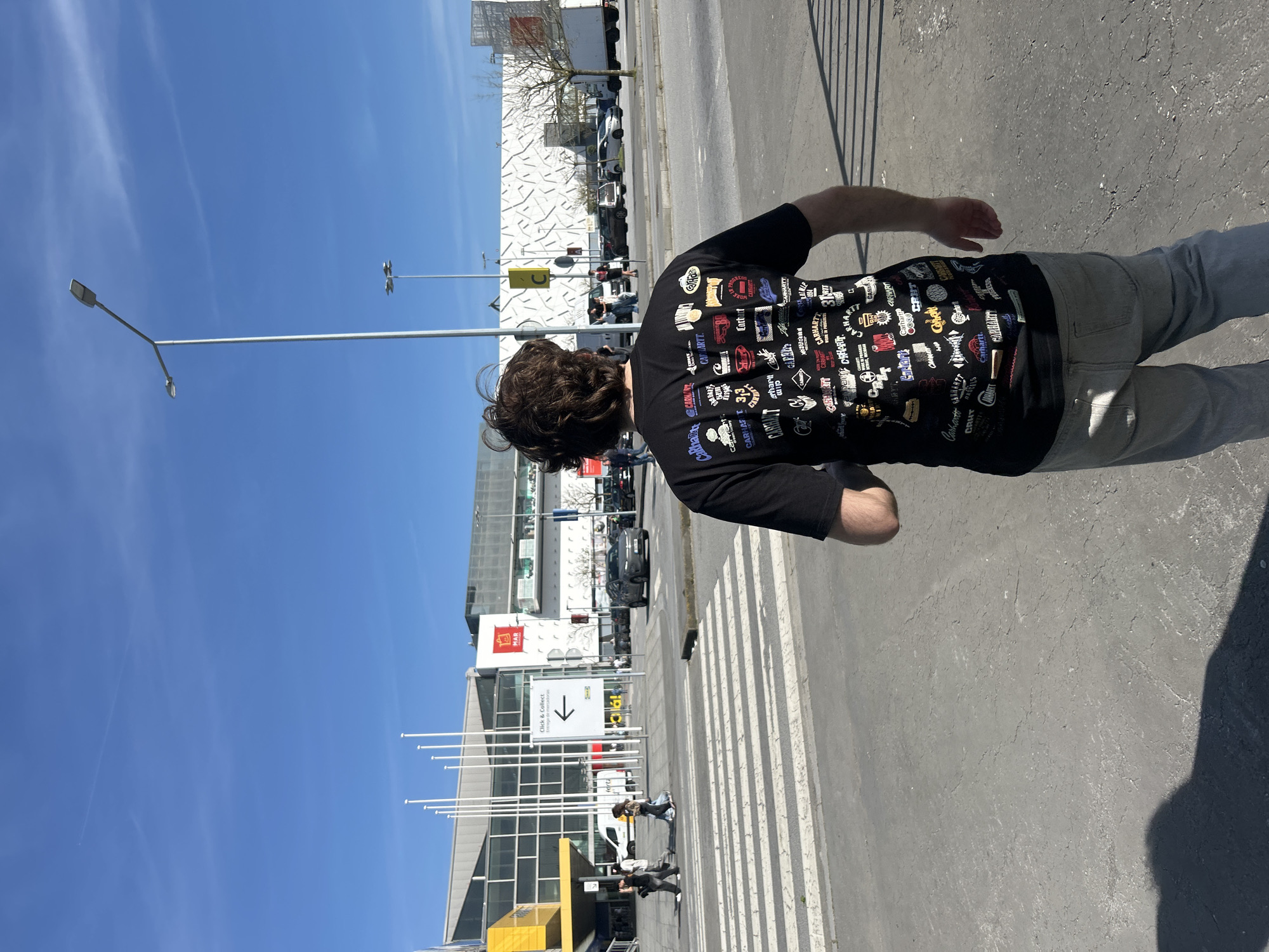 The image presents an outdoor scene on a clear, sunny day in Matosinhos, Portugal, specifically in the vicinity of MAR Shopping Matosinhos. A male individual is prominently featured in the foreground, viewed from behind and slightly off-center to the right. He possesses medium-length, dark brown, wavy hair and is clad in a black short-sleeved t-shirt extensively covered on the back with numerous colorful, stylized "Carhartt" brand logos and graphics. He wears light-colored jeans. He stands on cracked asphalt, facing towards a pedestrian crosswalk. His shadow is cast on the lower-left asphalt. In the midground, a white-striped pedestrian crosswalk spans an asphalt road. Multiple pedestrians are visible on the crosswalk and adjacent pavement, walking in various directions. A white panel van, partially branded "Hertz," is positioned near the crosswalk. Further back, several vehicles, including a dark SUV, are parked or moving in a paved area. The background is dominated by commercial architecture. To the left, a large, modern building with a distinct yellow facade section and extensive glass windows is visible, identified as part of an IKEA store. A "Click & Collect / Entrega de mercadorias" sign with a left-pointing arrow stands in front of this building. Behind and to the right of the IKEA, a large white building with a textured geometric pattern on its facade displays a prominent red "MAR Shopping" logo. Several tall, white, vertical poles are arranged in front of the IKEA structure. The sky is clear blue with minimal, wispy clouds and a faint aircraft contrail. Multiple streetlights and bare deciduous trees are also scattered throughout the background. A large white truck is visible parked in the far right background.