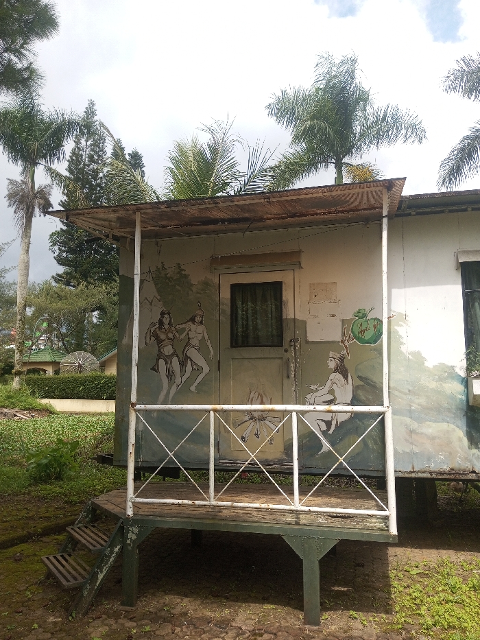 A weathered, elevated structure with a porch stands amidst greenery. The building's exterior is adorned with painted figures, including two indigenous-looking individuals dancing, a seated figure, and an apple logo. A white railing surrounds the porch, leading to a door. The roof is rusted. Palm trees and other foliage frame the scene, under a cloudy sky. The structure appears neglected and in need of repair.
