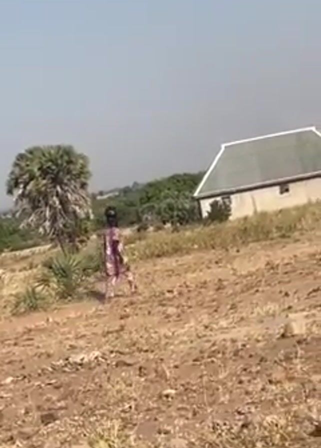 figure, presumably a person, walking in a sparsely vegetated, dry, dirt field. The person is wearing a pink and purple patterned outfit. Behind the person, to the left, stands a palm tree. Further behind the person and to the right is a simple, white, rectangular building with a gray, gabled roof. The sky is a hazy blue.