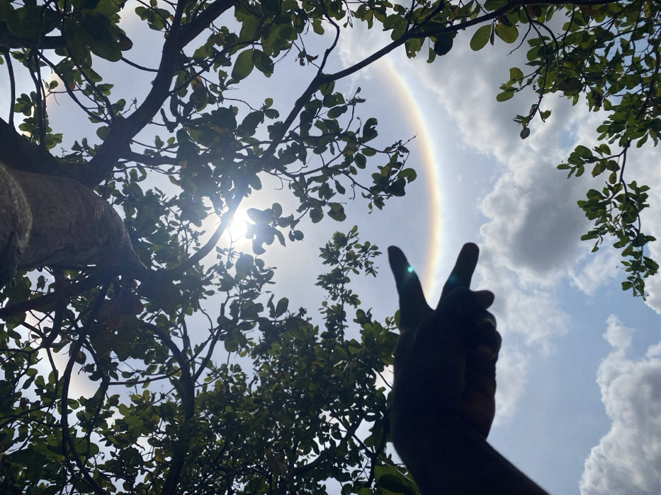 The image, captured in Igbara, Nigeria, presents an upward view through tree canopy towards a bright sky. The sun is intensely bright and centered in the upper frame. A partial solar halo, forming a multi-colored arc, is visible in the central sky below the sun. Dark green leaves and branches of a tree, including a portion of a thick trunk at the top, frame the scene, largely silhouetted against the light. A silhouetted human hand, located in the lower-left quadrant, extends its index and middle fingers, pointing towards the solar halo. Scattered white cumulus clouds are present in the background's blue sky.