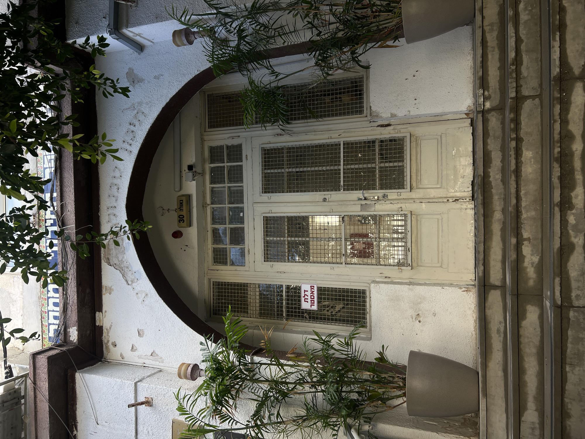 A daytime shot of a weathered white building entrance with a rounded arch in Tel Aviv, Israel. The entrance consists of double doors with multiple panes, each covered with a metal grid. A sign in Hebrew is affixed to the bottom right pane. Potted plants flank either side of the entrance. A number "30" is on a plaque, next to what appears to be a doorbell. The structure shows signs of age and wear, with peeling paint and visible imperfections. A narrow set of concrete stairs is visible to the right of the entrance. The building appears to be located in an alley, with another building visible in the background to the left.
