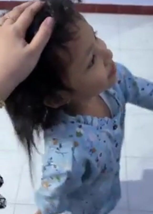 young child standing on a white tile floor. They are wearing a long-sleeved light blue pajama top with a floral pattern. A hand, presumably belonging to an adult, is petting the child's dark, short hair. The child looks up and to the side, smiling slightly. A red wooden baseboard is visible at the top of the frame.