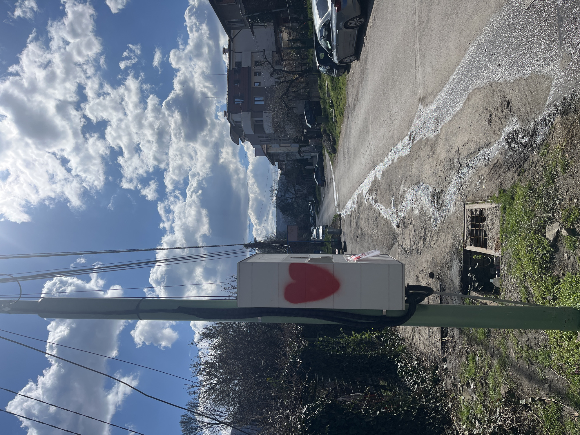 A daytime shot in Sofia, Bulgaria, presents a residential street scene. A green utility pole stands in the foreground, supporting a white utility box spray-painted with a red heart. Power lines extend from the pole into a bright, cloudy sky. Behind the pole, a paved street slopes upward, lined with parked cars on one side and a multi-story apartment building on the other. The street surface shows signs of water runoff and debris. A storm drain is visible on the right side of the road. Vegetation grows around the base of the utility pole.