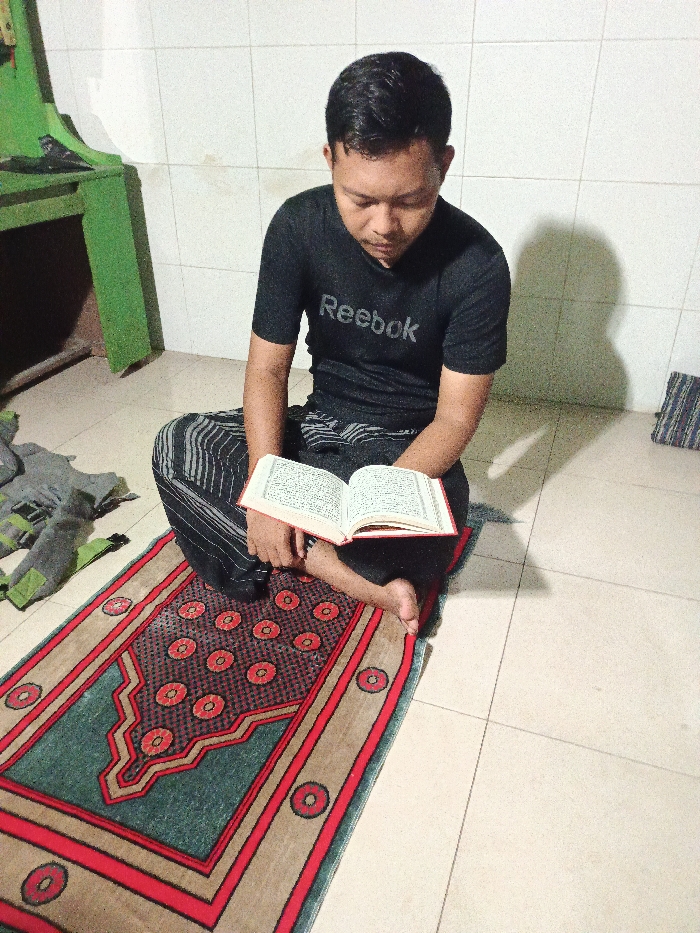 An adult male is seated cross-legged on a prayer mat indoors, in Kecamatan Pati, Indonesia