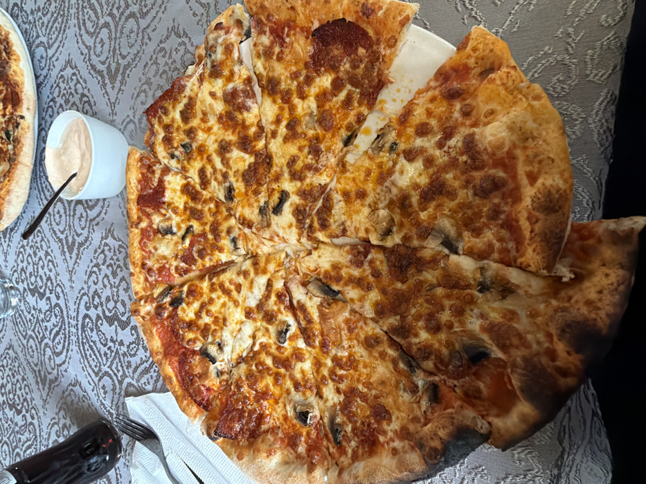 The image presents an overhead view of a dining table in an indoor setting in Sofia, Bulgaria. A large, circular pizza, sliced into eight segments, occupies the majority of the frame, resting on a white serving plate positioned on a grey tablecloth with a repeating ornate pattern. The pizza features a golden-brown melted cheese topping over a red tomato base, with visible mushroom slices distributed across most pieces. Several slices also display round, reddish-brown pepperoni pieces. The pizza crust exhibits a golden-brown coloration with some localized charring. To the upper left, a dark glass bottle, a clear drinking glass, and a silver fork resting on a folded white paper napkin are visible. In the upper right quadrant, a small white ceramic bowl contains a light orange/pink sauce, accompanied by a small spoon. A second, out-of-focus pizza on a white plate is partially visible in the upper background. No individuals are present within the frame. The scene depicts a meal prepared for consumption.
