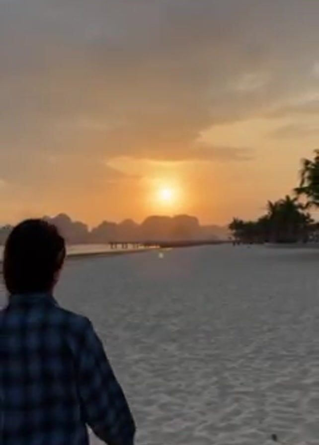sandy beach at sunset. The sky is a mix of orange and gray clouds, and the sun is a bright, round orb setting on the horizon. Silhouetted mountains can be seen in the distance. Palm trees line the right side of the beach. A person with short hair wearing a plaid shirt and dark pants is walking away from the camera towards the sunset. The person is carrying a book or package in their hand.
