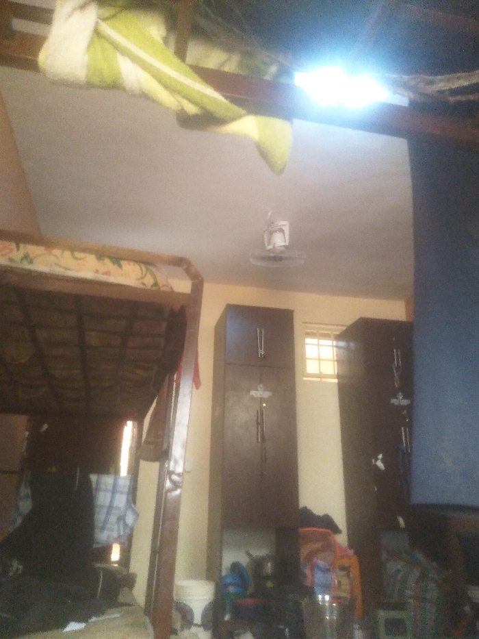 A cluttered room contains a bunk bed to the left and two dark wooden wardrobes against a yellow wall. A small window is positioned between the wardrobes. Below them, various items including bags, buckets, and containers are scattered. A fan hangs from the ceiling. Light streams in, casting shadows and blurring some details. A towel or cloth hangs over the bunk bed frame.