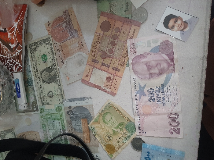 The image displays an overhead view of assorted currencies and objects spread across a light-colored, textured surface, likely a table, within Rukn ad-Din Municipality, Syria. Central to the arrangement is a 200 Turkish Lira banknote featuring Mustafa Kemal Atatürk. Adjacent to it are several Syrian Pound banknotes of varying denominations, including a green note with a portrait and a partially visible note depicting an architectural structure. A single US one-dollar bill is also present. Two silver-colored coins are visible among the banknotes. A white and blue disposable lighter lies near the US dollar. In the upper center, a clear, textured, bowl-like object rests on a brown and white spiderweb-patterned coaster. A small, rectangular portrait photograph of a young boy with dark hair, wearing a light-colored collared shirt and looking directly at the viewer with a slight smile, is positioned in the lower right quadrant. A black strap, likely from a bag, is visible along the left edge of the frame. No individuals are actively present or engaged in the scene.