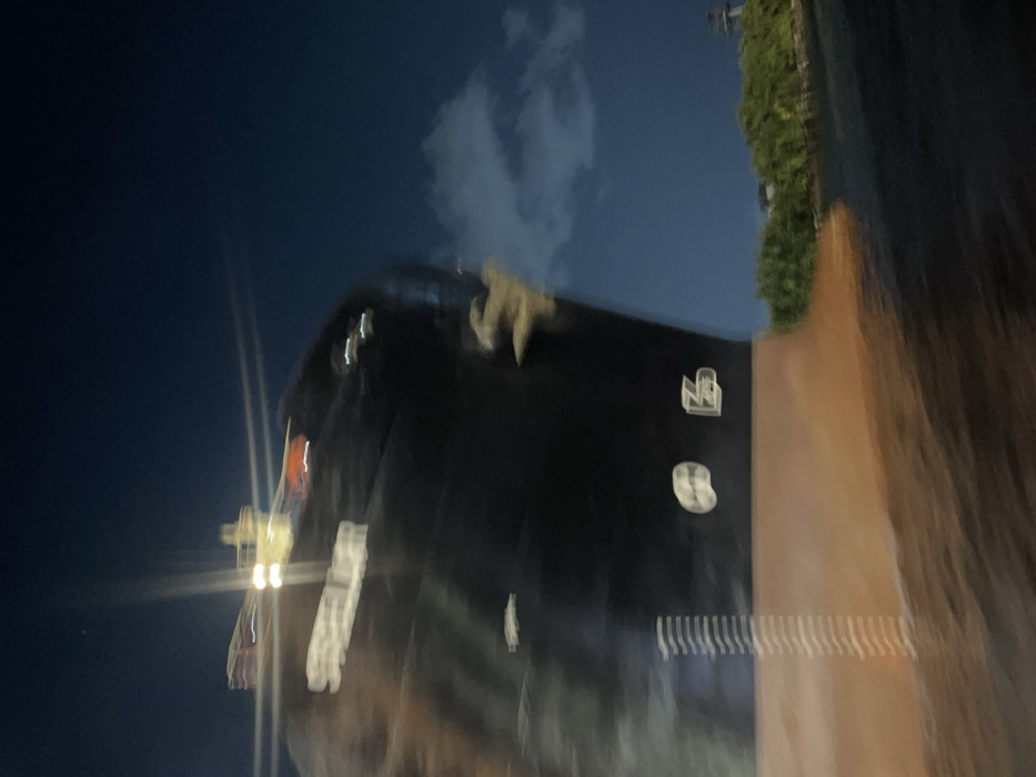 At night, a blurry view captures a dark, rounded structure with light reflecting off its surface. The top of the structure appears to have a decorative element. To the right, there's a vertical strip of greenery. Above, wisps of white resemble smoke or clouds against a dark blue sky. The overall image has a sense of motion, and the objects are not sharply defined.