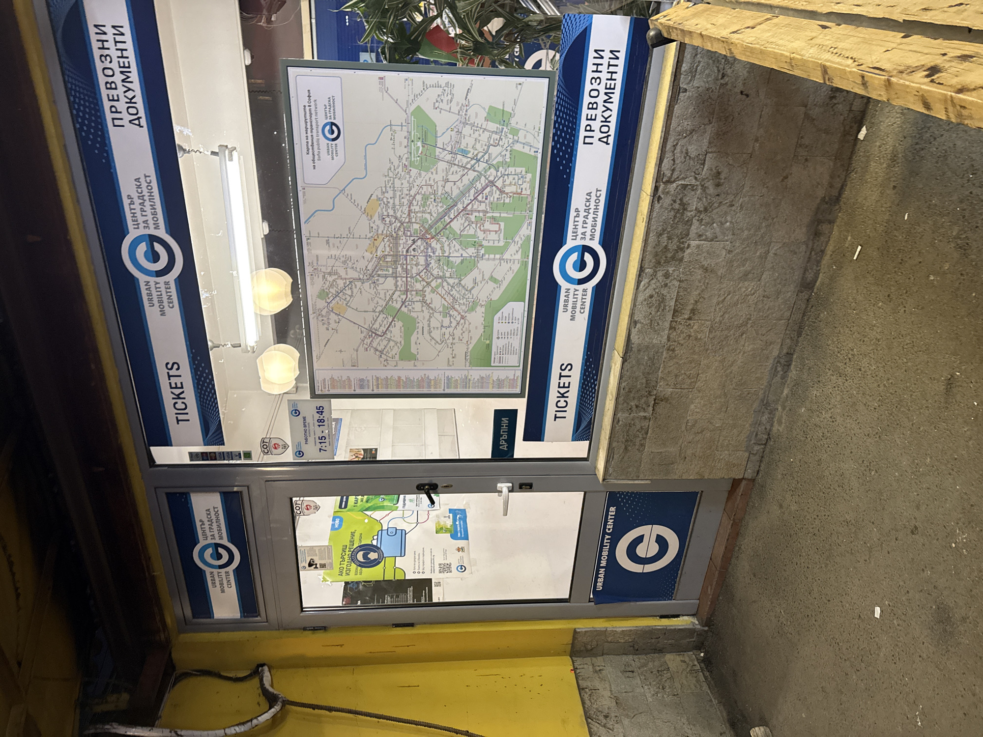 The image displays the exterior of an "Urban Mobility Center" ticket office or information point located in Sofia, Bulgaria. The structure features a glass door on the left and a large display window on the right, both framed in grey metal. The building's exterior on the left is a bright yellow wall, with the lower section faced with grey, rough-hewn stone or tiles extending across the base of the entire structure. The ceiling appears dark and unfinished, with exposed wiring visible. Above the glass door, a blue sign with white text reads "URBAN MOBILITY CENTER" and "ЦЕНТЪР ЗА ГРАДСКА МОБИЛНОСТ" (Urban Mobility Center), featuring a stylized 'C' logo. Similar signage is present above the main display window, stating "TICKETS" and "ПРЕВОЗНИ ДОКУМЕНТИ" (Transport Documents), flanking the same logo. A smaller sign to the right of the door indicates "РАБОТНО ВРЕМЕ" (Working Hours) as "7:15 - 18:45". The glass door is adorned with multiple notices and posters, including a green and white poster with a QR code and Bulgarian text, and a "COT 161" logo. A white door handle and a dark lock are visible. The large display window prominently features an illuminated map titled "Карта на маршрутите на обществения транспорт в София" (Map of public transport routes in Sofia), confirming the specific location. Two spherical, pale-yellow light fixtures and a linear fluorescent light bar illuminate the interior above the map. Partially visible within the window on the right is a green leafy plant. Below the main display window, a lower panel mirrors the upper signage with "TICKETS," the "Urban Mobility Center" logo, and "ПРЕВОЗНИ ДОКУМЕНТИ." The ground in the foreground is a speckled grey concrete or asphalt surface, with a small white piece of litter near the bottom center. To the far right, the edge of a rough-hewn wooden bench or structure is partially visible. No individuals are present, and no actions are occurring.