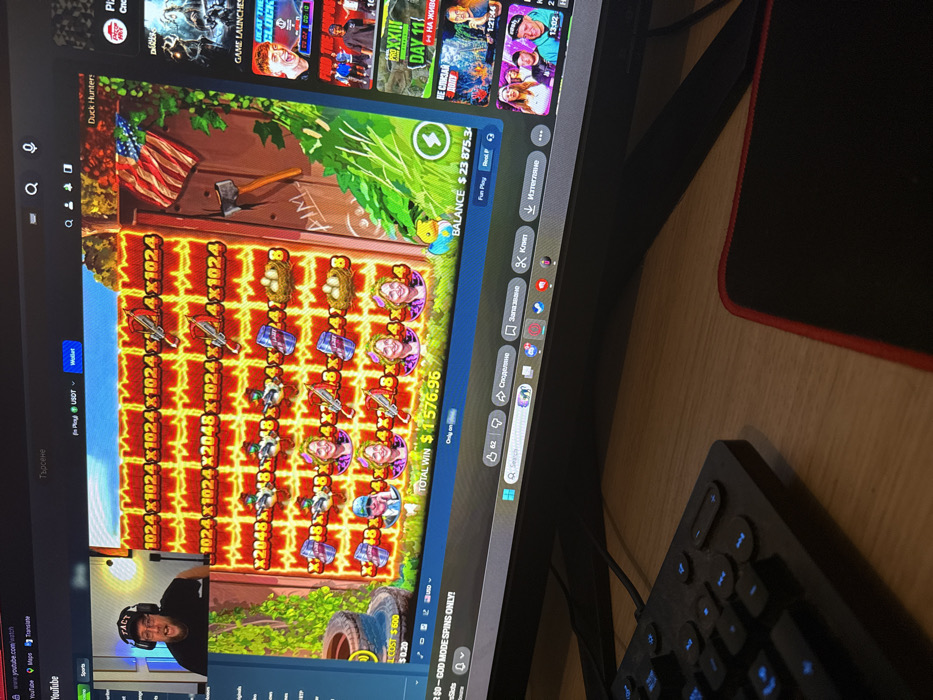 The image displays a computer monitor showing a YouTube video and an online slot machine game, positioned on a wooden desk. The monitor's upper left section features a male streamer wearing a black 'FACT' cap and a headset, with his mouth open, suggesting he is speaking or reacting. The central and right portion of the screen shows an active online slot game titled "Duck Hunters," displaying a "TOTAL WIN $1576.96" and a "BALANCE $23 875.34". The game's reels feature symbols including ducks, beer cans, eggs in nests, crossbows/arrows, and cartoon characters of a man and multiple blonde women. The game's background illustrates a rustic scene with a wooden fence, an American flag, an axe embedded in the wood with "AIM" carved below it, and green foliage. A large, old tire is visible on the left side of the game interface. The browser's top bar indicates "YouTube" and shows options for cryptocurrency (USDT) and a "Wallet." A sidebar on the right presents several YouTube video thumbnails. The bottom edge of the monitor partially displays a Windows taskbar with various application icons and Cyrillic text. In the foreground, a light-colored wooden desk surface is visible, supporting a partially cropped black wired keyboard with blue-illuminated keys on the left and a black mousepad with a red stitched edge on the right. The location is an indoor setting in Unknown, Unknown.