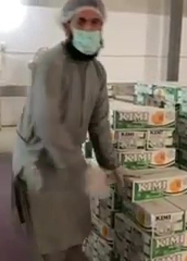 man in a grey dishdasha, hairnet, and face mask standing in a warehouse with stacks of boxes labeled "KIMI