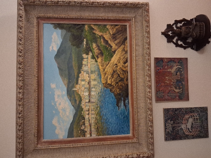 The image features a landscape painting in a decorative, aged frame. The painting depicts a coastal town nestled against a cliffside, with mountains in the background and blue water in the foreground. To the right of the painting are a dark, ornate wall fixture and two small, framed artworks with intricate patterns. The scene is set against a neutral, off-white wall.