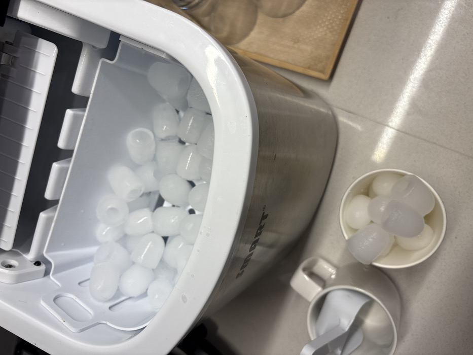 This image, taken in Ness Ziona, Israel, displays a close-up view of a domestic ice-making scene on a light-colored countertop