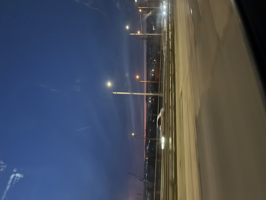 The image presents a nighttime or dusk scene captured from inside a moving vehicle on an elevated road, specifically identified as the Asparuhov Bridge in Varna, Bulgaria. The perspective looks generally eastward towards the city and port. The sky overhead is a deep indigo, transitioning to a narrow, faint reddish-orange band along the distant horizon. Reflections from the interior of the observer's vehicle are visible in the upper portion of the frame. The foreground depicts the asphalt surface of the multi-lane bridge, exhibiting significant motion blur. Multiple streetlights with bright, white-yellow illumination line the bridge structure. Two vehicles are discernible, both affected by motion blur, indicating movement: a light-colored sedan in the mid-ground, appearing to travel from left to right, and another vehicle on the far right, identifiable only by its bright headlights, also moving right. Below the bridge and extending across the left mid-ground, the industrial area of the Port of Varna is visible, characterized by several prominent cranes and other industrial structures. Beyond this industrial complex, the illuminated cityscape of Varna stretches across the background, marked by numerous individual lights from buildings. No individuals are distinctly identifiable within the scene.