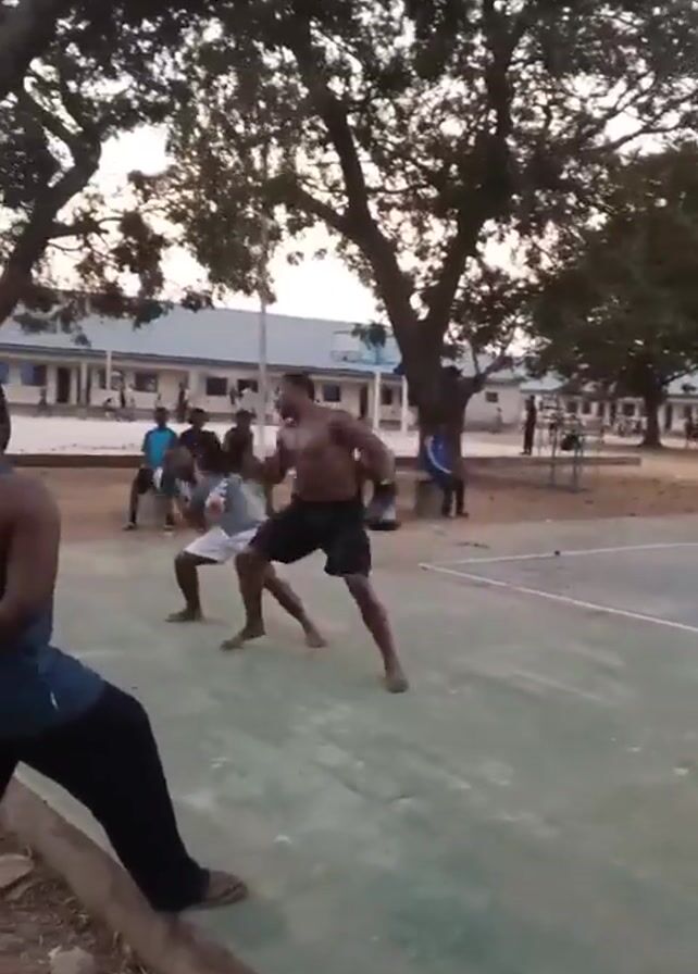 two men sparring, or practicing boxing, on an outdoor green court. One man wears grey shorts and a grey tank top, along with boxing gloves, while the other man wears black shorts and no shirt, also with boxing gloves. They are barefoot. There are other people watching them from the sides of the court, some sitting on benches and others standing. There are also trees surrounding the court, and a building can be seen in the background. One man is sitting on the edge of the court in the foreground, facing away from the camera. The light suggests it is late afternoon or early evening.