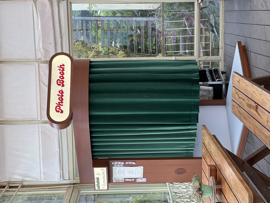 A vintage-style photo booth stands indoors, featuring a brown frame and a vertically oriented "Photo Booth" sign in red script. A heavy, dark green curtain serves as the backdrop. The booth includes signage in a non-English language, along with a series of decorative stickers. To the right, wooden furniture is visible, hinting at a cafe or restaurant setting. Windows with greenery and outdoor views flank the booth, suggesting a garden or patio area.