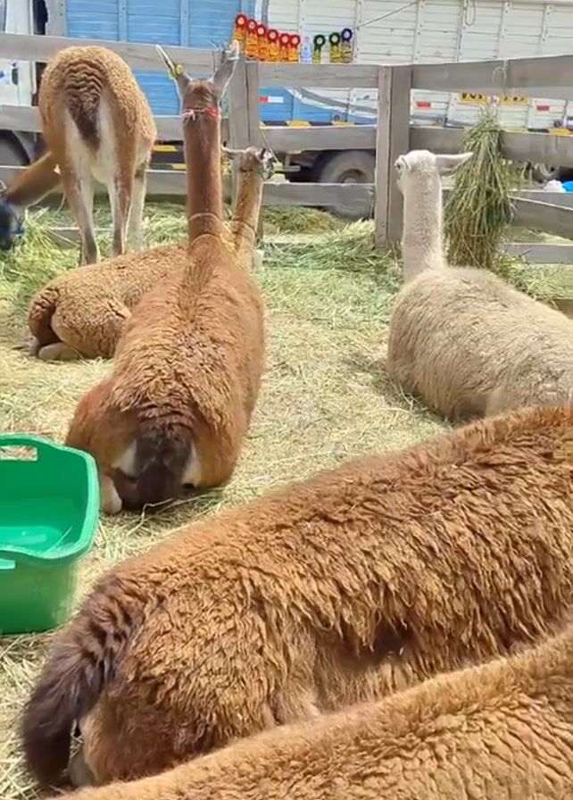 pen of llamas lying on straw. There are at least six llamas in the pen, varying in color from light beige to dark brown. Some are standing and some are lying down. There is a green water trough in the foreground. A white truck with a blue bed is parked behind the pen. The pen is made of wooden fencing. The sky is overcast.
