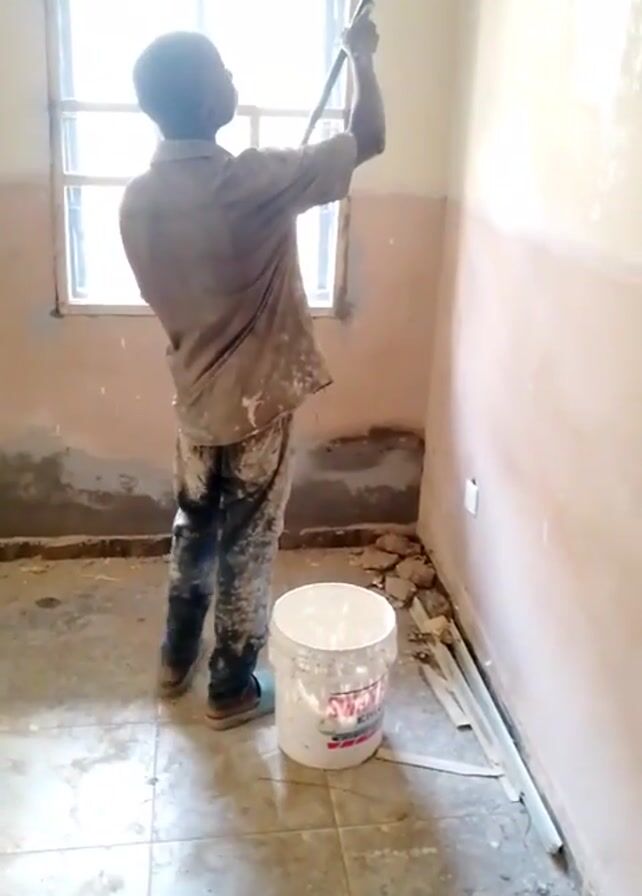 A person is shown from the rear standing in a room that appears to be under renovation, painting the upper portion of a wall