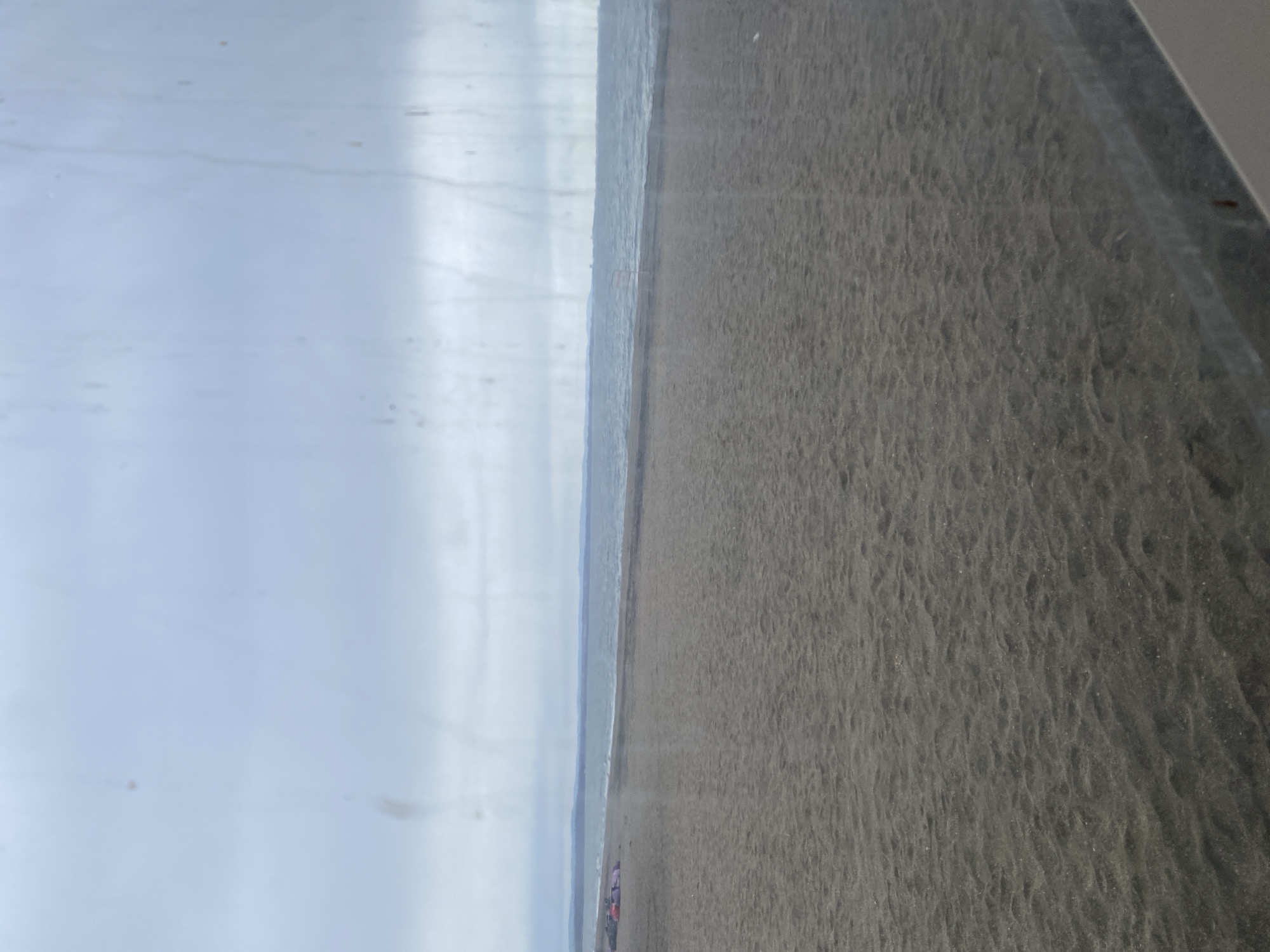 beach in Burgas, Bulgaria. The scene is divided into three distinct sections: the sky, the sea, and the beach. The sky is overcast and light gray. The sea is a darker shade of gray with small waves. The beach is composed of dark gray sand. The image is taken from a high vantage point, possibly from a building overlooking the beach. The scene includes a small group of people in the distance at the bottom edge of the image. The picture is slightly distorted.